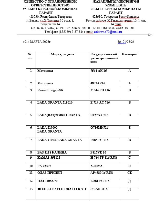 — Учебная закрытая площадка общей площадью 6 123 кв.м. для обучения первоначальным навыкам вождения находится по адресу: РТ г.Бавлы, ул.Промышленная ,32 (Свидетельство о государственной регистрации серия 16-АН № 664625 от 19.12.2014 г, собственность ООО УКК Гарант».